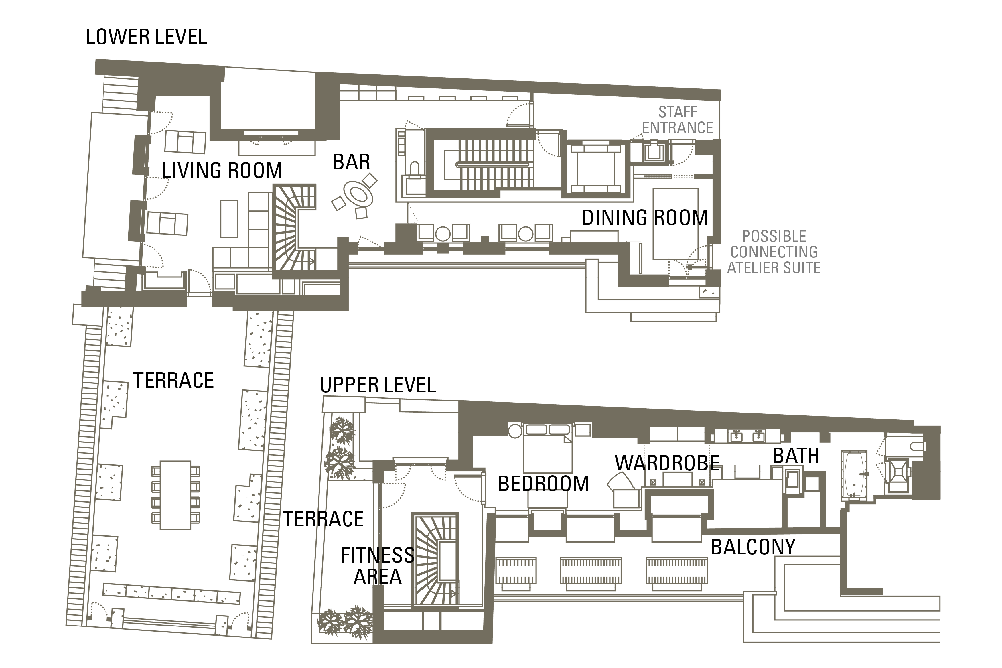 此错层套房气派非凡,设有卧室、起居室和用餐区,浴室配有蒸汽淋浴和浴缸。75平方米的露台配有餐桌和屋顶可拆卸的凉亭,宾客可在此欣赏巴黎歌剧院和蒙马特的美景。如需预订,请发送电子邮件至 mopar-reservations@mohg.com。