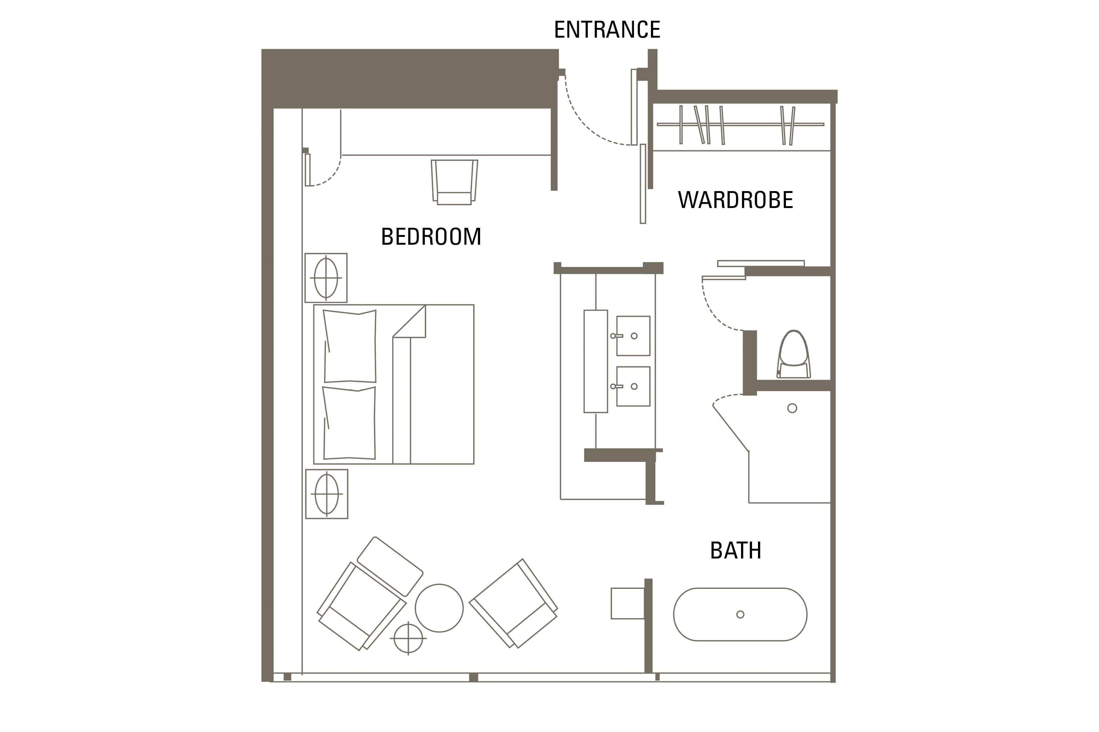 房間的室內設計處處反映東方文化的精髓,環境寧靜,淺色的毛絨地毯和牆壁互相襯托,營造出舒適時尚的氛圍。落地玻璃窗讓滿盈的日光穿透整個房間,充滿溫暖和煦的愜意。